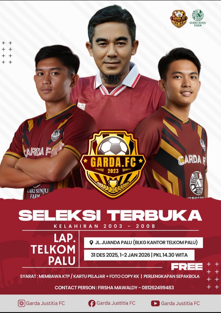 ELSINDO, PALU – Harapan baru bagi sepak bola Sulawesi Tengah kembali menyala. Garda Justitia Sulawesi Tengah FC (Garda FC) resmi membuka seleksi terbuka bagi talenta muda kelahiran tahun 2003 hingga 2008, sebagai langkah nyata membangun regenerasi sepak bola daerah yang lebih kuat dan berkarakter.