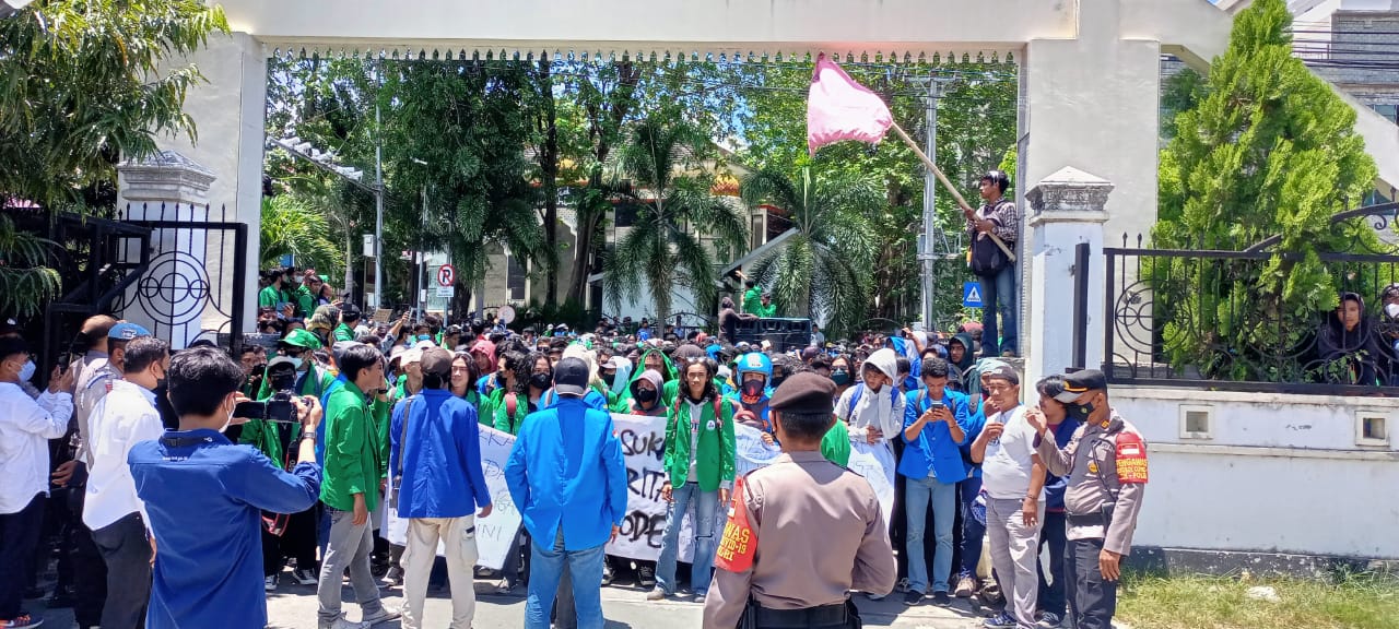 ELSINDO, PALU- Ratusan mahasiswa di Kota Palu, Sulawesi Tengah, yang tergabung dalam Aliansi Mahasiswa Palu mendatangi kantor DPRD Sulteng, Senin, 11 April 2022.