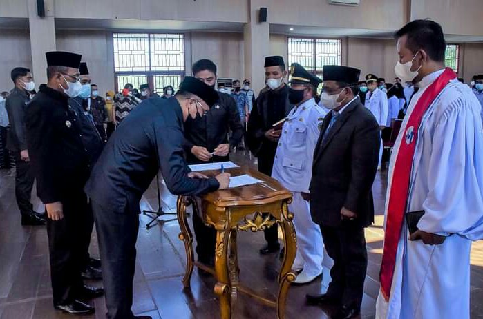 ELSINDO, MORUT- Bupati Morowali Utara (Morut) Delis Julkarson Hehi melantik 163 pejabat struktural dan fungsional di lingkungan Pemda Morut, di Ruang Pola Kantor Bupati Morut di Kolonodale, Kamis, 12 Mei 2022.
