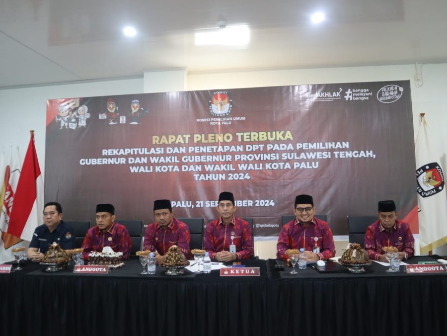 ELSINDO, PALU- Komisi Pemilihan Umum (KPU) Kota Palu menggelar Rapat Pleno Terbuka terkait rekapitulasi dan penetapan Daftar Pemilih Tetap (DPT) untuk Pemilihan Gubernur dan Wakil Gubernur Sulawesi Tengah serta Wali Kota dan Wakil Wali Kota Palu tahun 2024.