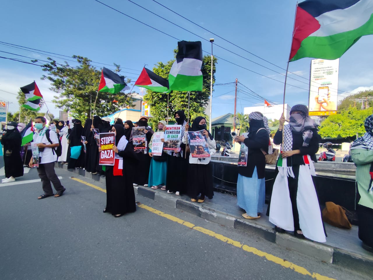 Para peserta aksi membawa spanduk dan poster dengan berbagai tuntutan, termasuk menghentikan genosida di Gaza, stop bombing Gaza, dan boikot Israel. Mereka juga menyerukan bantuan kemanusiaan untuk warga Palestina yang terkena dampak konflik.