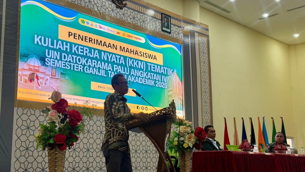 ELSINDO, PALU– Rektor UIN Datokarama Palu Prof. Dr. H. Lukman S. Thahir menerima secara resmi mahasiswa kuliah kerja nyata (KKN) Tematik Angkatan IV Semestet Ganjil Tahun 2025 di Auditorium Kampus UIN Datokarama, Sabtu, 13/12/2025.