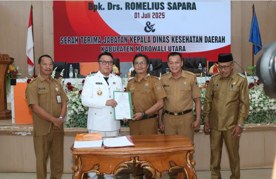 ELSINDO, MORUT- Kepala Dinas Kesehatan Kabupaten (Kadinkes) Morowali Utara, Drs. Romelius Sapara, resmi memasuki masa purna tugas dan menyerahkan jabatannya kepada Pelaksana Tugas (Plt) yang baru dalam upacara serah terima jabatan (sertijab) di Ruang Pola Kantor Bupati, Rabu (1/7/2025).