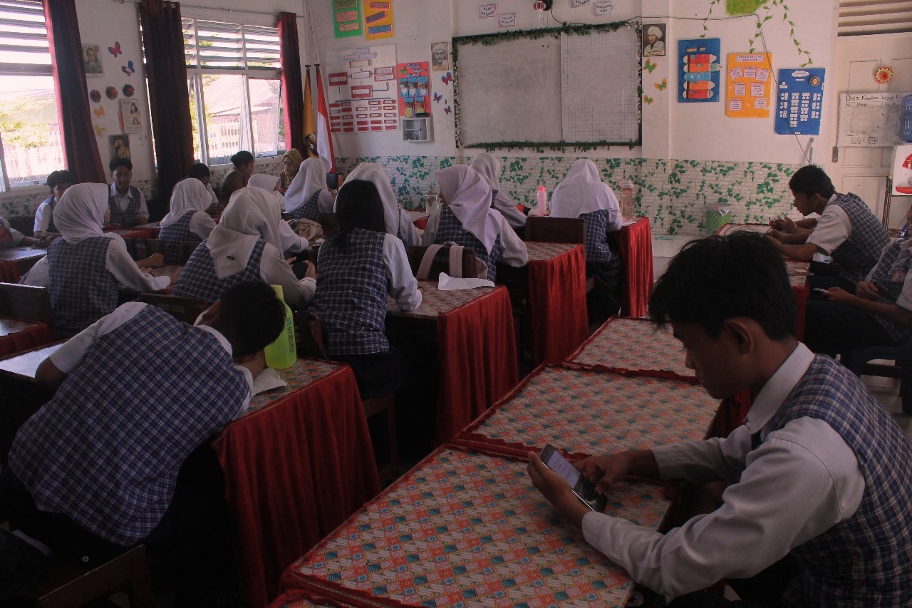 ELSINDO, PALU- Ujian Nasional (UN) di SMP Negeri 3 Palu, menerapkan metode akun Belajar.id. Penerapan metode tersebut, berjalan optimal tanpa kendala di hari pertama saat ujian berlangsung, dengan total keseluruhan partisipan peserta didik kelas IX sejumlah 375 peserta.